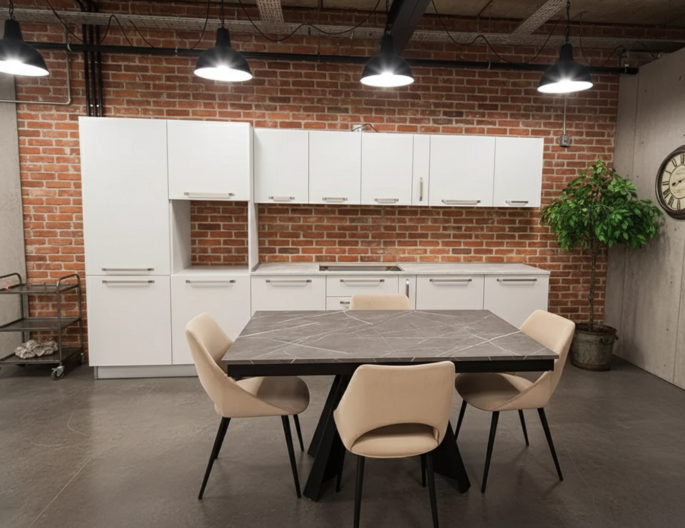 Cucina lineare moderna bianca in stile industriale, con finitura grigio matt e dettagli materici. Cappa inclusa, elettrodomestici esclusi. Disponibilità limitata in showroom.