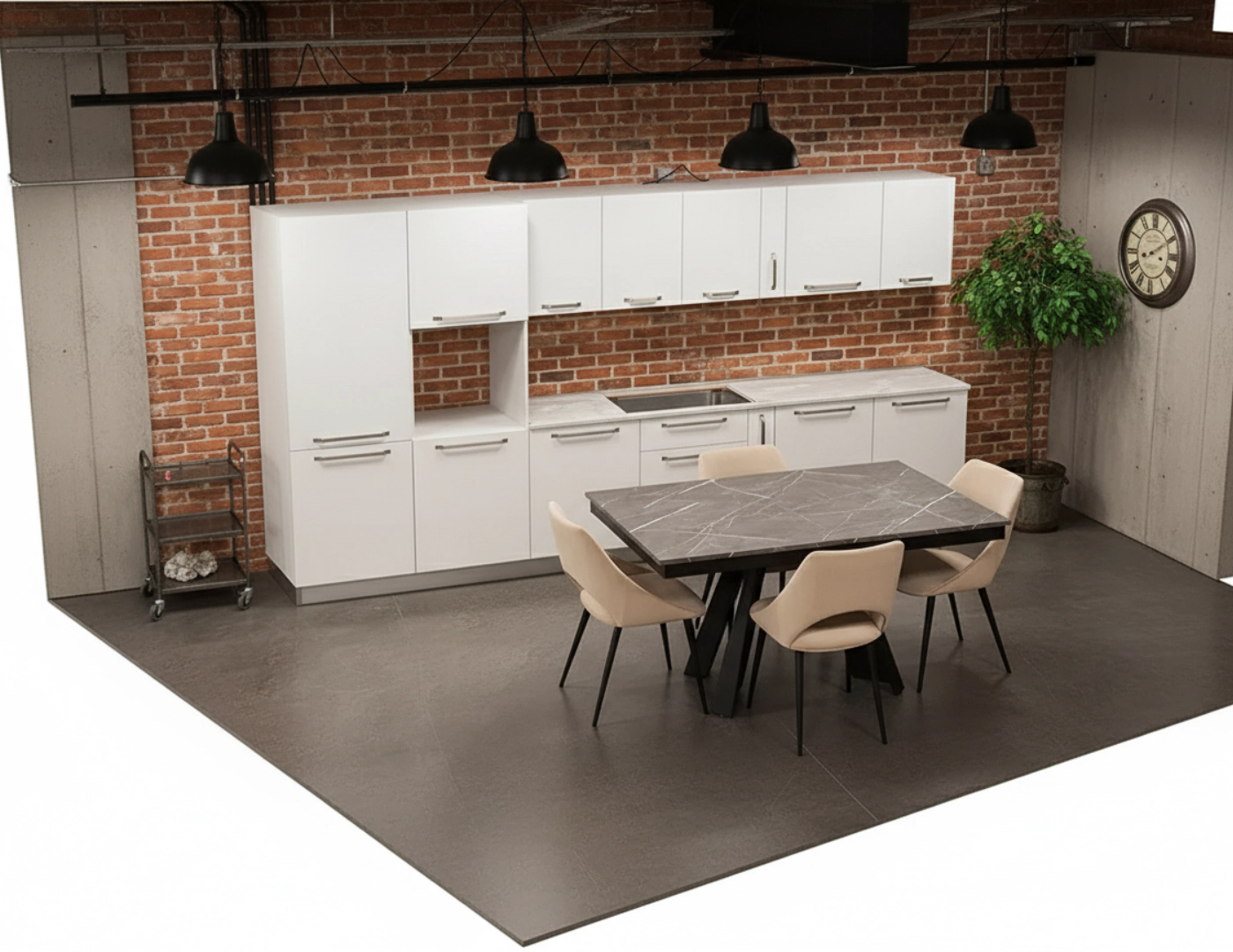 Eleganza contemporanea e carattere urbano si incontrano in questa cucina lineare moderna bianca con dettagli industriali, pensata per chi ama un ambiente cucina dallo stile ricercato e funzionale.
