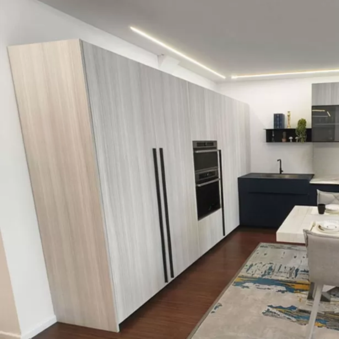 Funzionalità, estetica e sostenibilità si incontrano in questa cucina lineare realizzata in PET riciclato, pensata per chi cerca una soluzione d’arredo moderna ma con un occhio attento all’ambiente. Le superfici opache donano un’eleganza sobria, mentre il contrasto tra le basi blu profondo e i pensili bianchi crea un effetto visivo accattivante, perfetto per ambienti contemporanei.