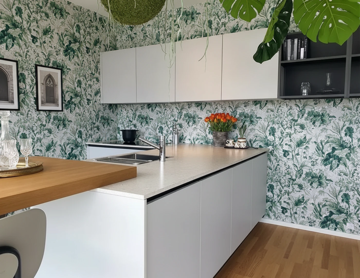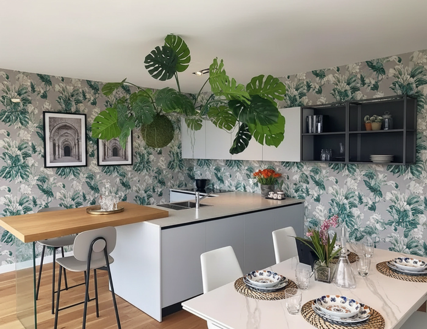 La penisola centrale con il suo magnifico piano snack in rovere naturale diventa il punto focale di ogni momento sociale. Qui le colazioni si trasformano in rituali di benessere, gli aperitivi con gli amici diventano celebrazioni di stile, e ogni pasto si colora di quella calda intimità che solo il legno autentico sa donare. La struttura a sbalzo crea un effetto di leggerezza architettonica che amplifica visivamente lo spazio, mentre il contrasto cromatico con le basi bianche genera un dinamismo visivo di straordinaria modernità.